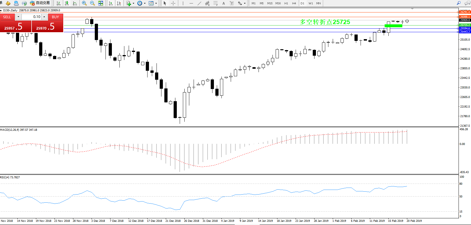 北京时间周四(221)凌晨03:00,美联储公布1月货币政策会议纪要,美联储官员认为经济将持续扩张,就业市场强劲,通胀接近目标,几乎所有的委员希望在今年晚些时候结束缩表,几名委员认为如果经济处于正轨,2019年将会加息。美联储今年3月维持利率在2.25%-2.5%区间的概率维持在98.7%不变,降息概率维持在1.3%不变;今年6月维持利率在该区间的概率由96.7%下降至93.8%,加息和降息的概率分别由0%3.2%升至0%6.4%。道琼斯工业平均指数收涨63.12点,涨幅0.24%,报25954.44点。