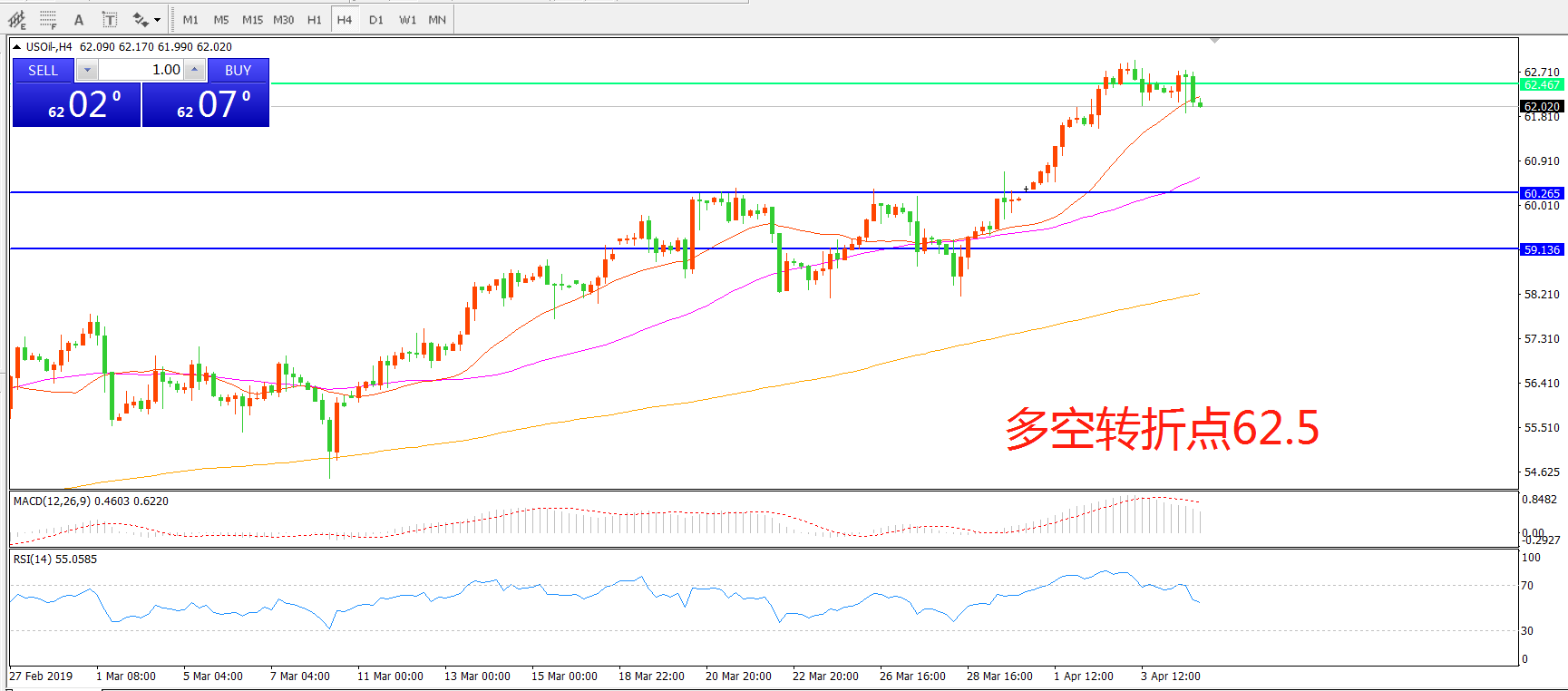 4小时图看,油价上冲62.7美元一线小幅回落,显示上方阻力较强,均线系统呈多头排列,MACD红柱缩短,RSI指标走平,62.5美元一线再次成为多空分水岭.