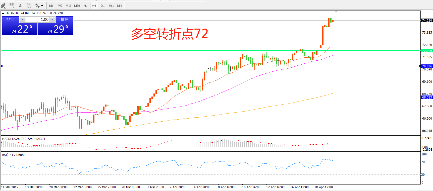 4小时图看,油价一柱擎天,强势突破前期阻力72,短期走势偏强,均线系统粘合形成下方支撑,MACD红柱增加,RSI指标走平,日内以多头思路为主。