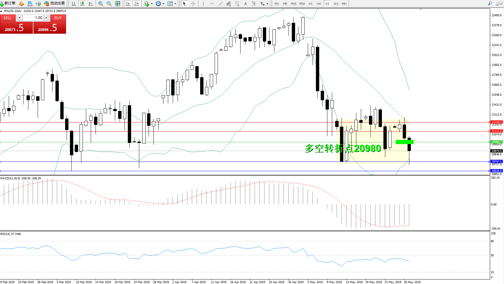 日经指数触及两周低位,因持续的中美贸易摩擦导致投资者看衰对中国有较大曝险的企业。金融股亦下跌,因中美贸易战对全球经济增长影响的风险,导致美国公债收益率跌至20179月以来最低。日经指数N225收跌1.21%21,003.37点,盘中一度跌至20,884.61点,为514日以来最低水准。国际投资人大概已经决定出脱风险资产,因为美中贸易战的情况没有改变,全球债券收益率下滑令市场感到不安。