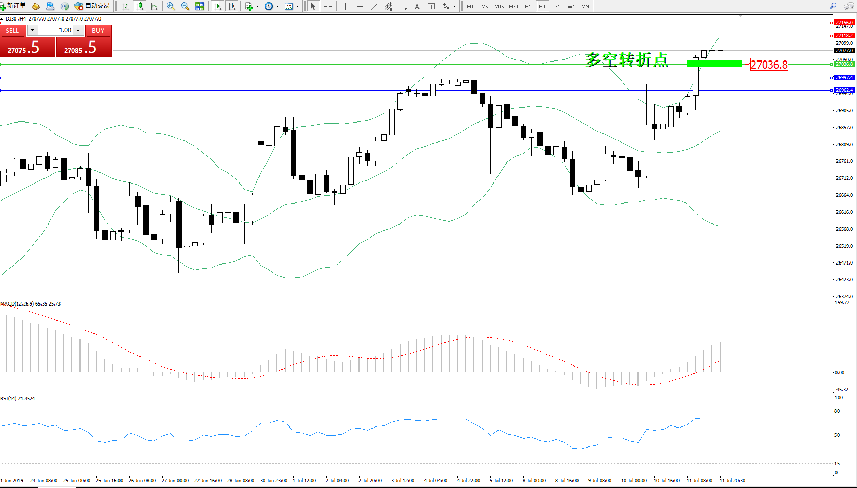 道琼斯指数711日(周四)收盘上涨227.90点,涨幅0.85%,报27088.08点。美联储率先放鸽之后,市场预期欧银9月降息概率升至80%。美国6月份CPI创下近一年半年来最大涨幅,但可能不会改变美联储本月将降息的预期。鲍威尔对国会议员表示,美联储将"采取适当行动",保护美国经济免受贸易局势和全球经济增长放缓等日益加剧的风险影响。