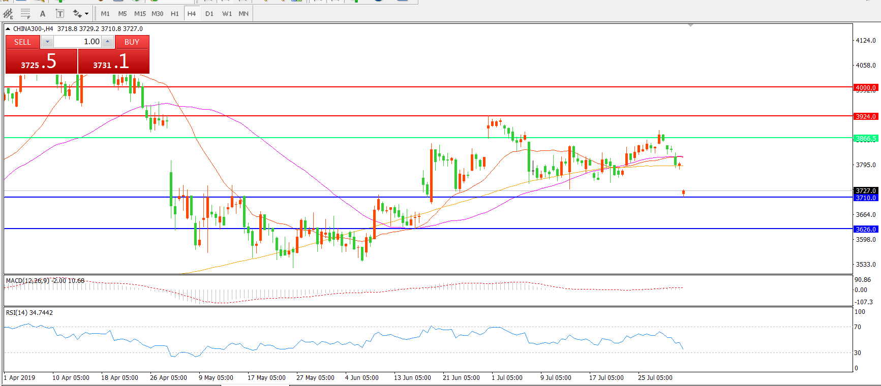 4小时图看,沪深300指数呈现弱势震荡走势,均线粘合形成上方阻力,RSI指标走平,日内延续下行概率较大。