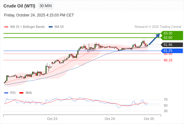 在 61.25 之上,看涨,目标价位为 62.80 ,然后为 63.30 。