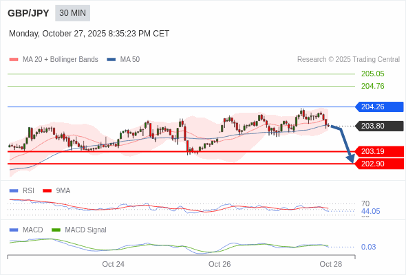 英镑/日元 当日内 : 看跌,当 204.26 为阻力位。