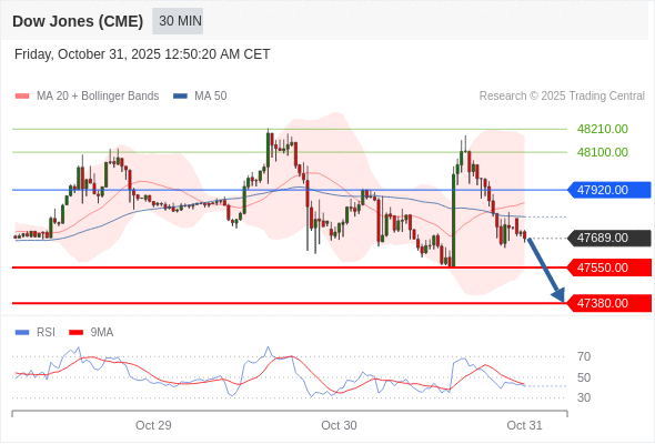 交易策略: 在 47920.00 之下,看跌,目标价位为 47550.00 ,然后为 47380.00 。
