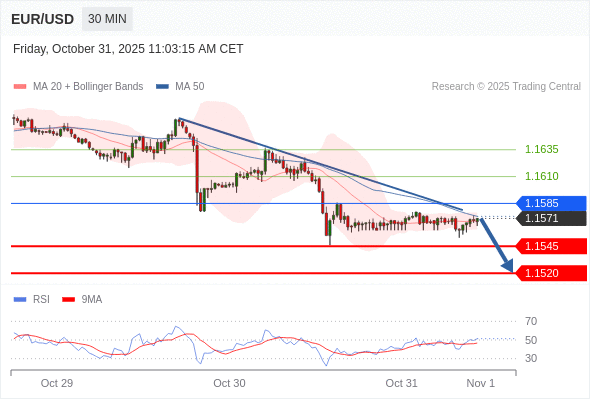 在 1.1585 之下,看跌,目标价位为 1.1545 ,然后为 1.1520 。