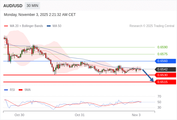 在 0.6560 之下,看跌,目标价位为 0.6530 ,然后为 0.6515 。