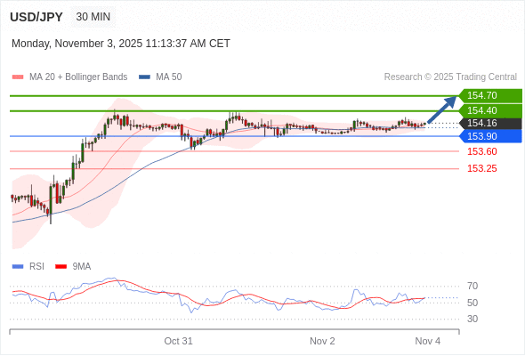 在 153.90 之上,看涨,目标价位为 154.40 ,然后为 154.70 。