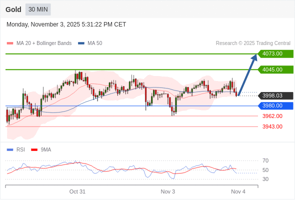 在 3980.00 之上,看涨,目标价位为 4045.00 ,然后为 4073.00 。