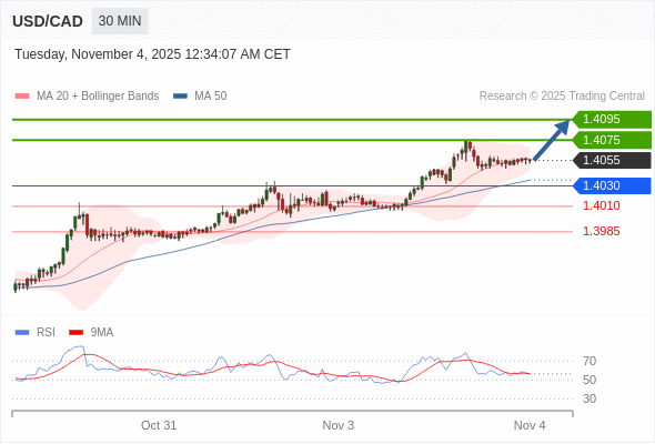 在 1.4030 之上,看涨,目标价位为 1.4075 ,然后为 1.4095 。