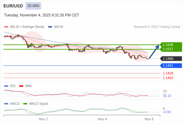 欧元/美元 当日内 : 有上涨的可能,目标价位定在 1.1536 。