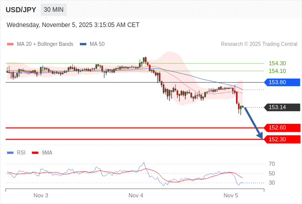 在 153.80 之下,看跌,目标价位为 152.60 ,然后为 152.30 。