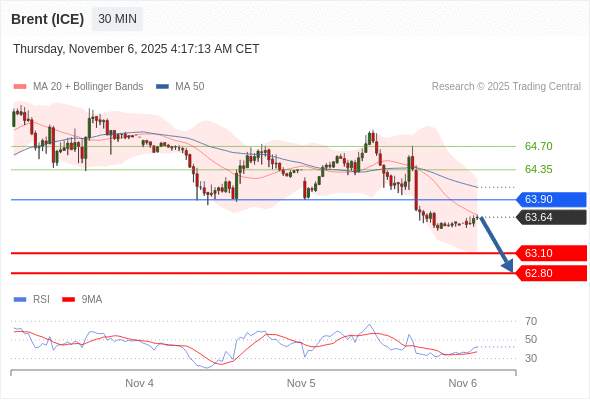 在 63.90 之下,看跌,目标价位为 63.10 ,然后为 62.80 。