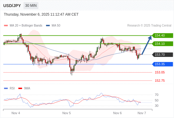 在 153.35 之上,看涨,目标价位为 154.10 ,然后为 154.40 。