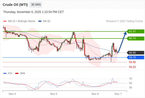 在 59.70 之上,看涨,目标价位为 60.70 ,然后为 61.07 。