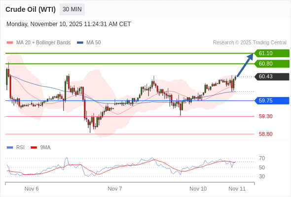在 59.75 之上,看涨,目标价位为 60.80 ,然后为 61.10 。