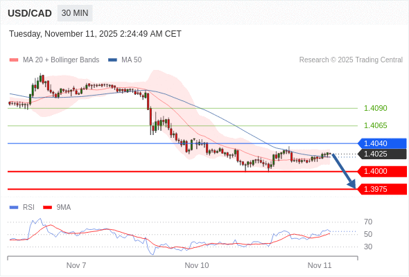 交易策略: 在 1.4040 之下,看跌,目标价位为 1.4000 ,然后为 1.3975 。
