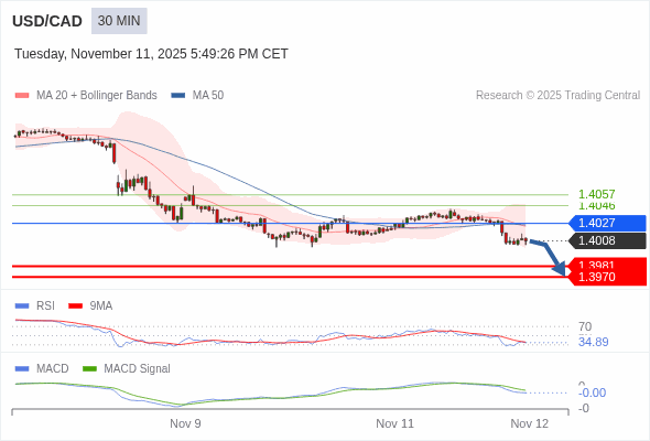 美元/加元 当日内 : 看跌,在 1.4027 之下。