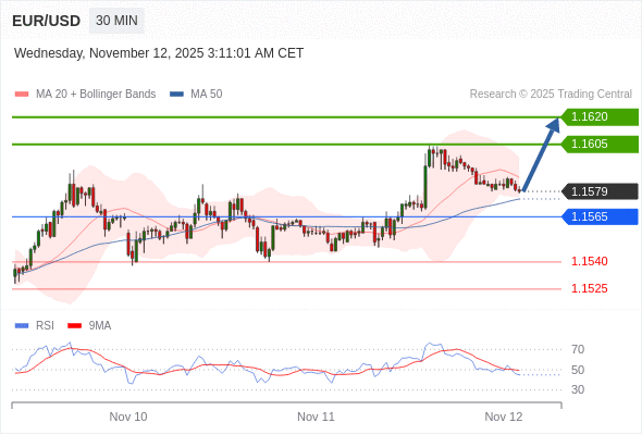 在 1.1565 之上,看涨,目标价位为 1.1605 ,然后为 1.1620 。