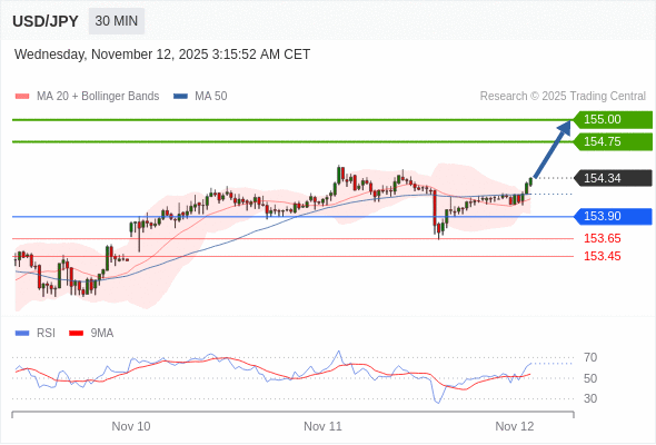 在 153.90 之上,看涨,目标价位为 154.75 ,然后为 155.00 。
