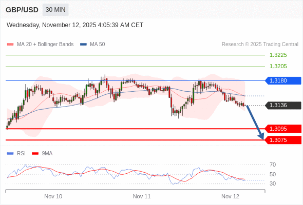 在 1.3180 之下,看跌,目标价位为 1.3095 ,然后为 1.3075 。