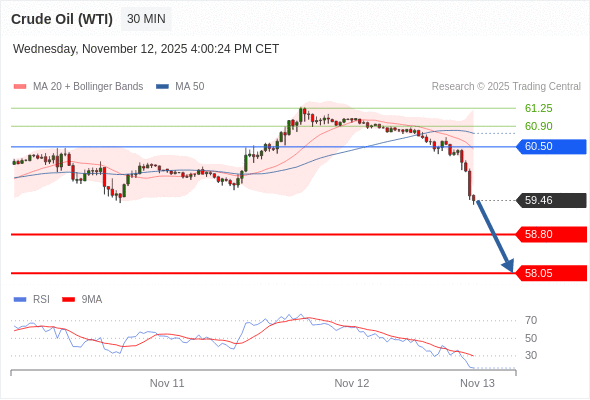 在 60.50 之下,看跌,目标价位为 58.80 ,然后为 58.05 。