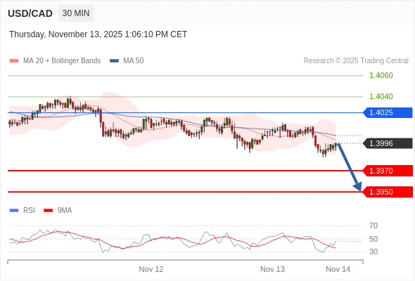 在 1.4025 之下,看跌,目标价位为 1.3970 ,然后为 1.3950 。