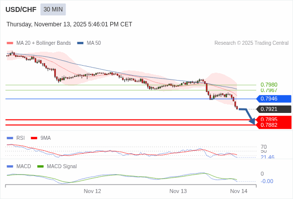 技术点评: RSI技术指标小于30。在这种情况下,说明有很强的下跌趋势,或者意味着处在超卖的状态下,可能会有向上的反弹。我们将观察RSI技术指标是否出现背离现象。 MACD技术指标处在其信号线之下看空。 配置为负。 此外,价位低于其20天及50天移动平均线 ( 分别位于0.7954 和0.7970 )。 最后,价位跌破其布林线通道下轨 (位于0.7923。
