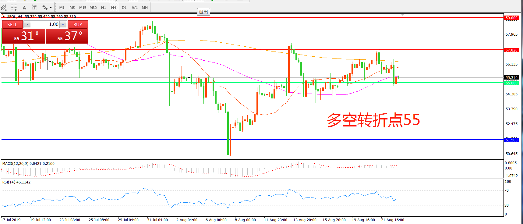 周四(8月22日),因投资者关注焦点集中在杰克逊霍尔央行年会方面,从而暂时保持谨慎,贸易局势以及经济放缓引发的原油需求忧虑令油价再度承压,美油再次下探55美元支撑,最终收报55.36美元。但EIA原油库存下降依然为油价带来一定支撑,整体维持宽幅震荡概率较大。