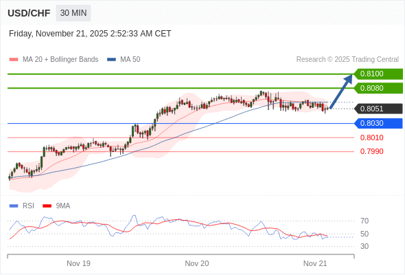 在 0.8030 之上,看涨,目标价位为 0.8080 ,然后为 0.8100 。