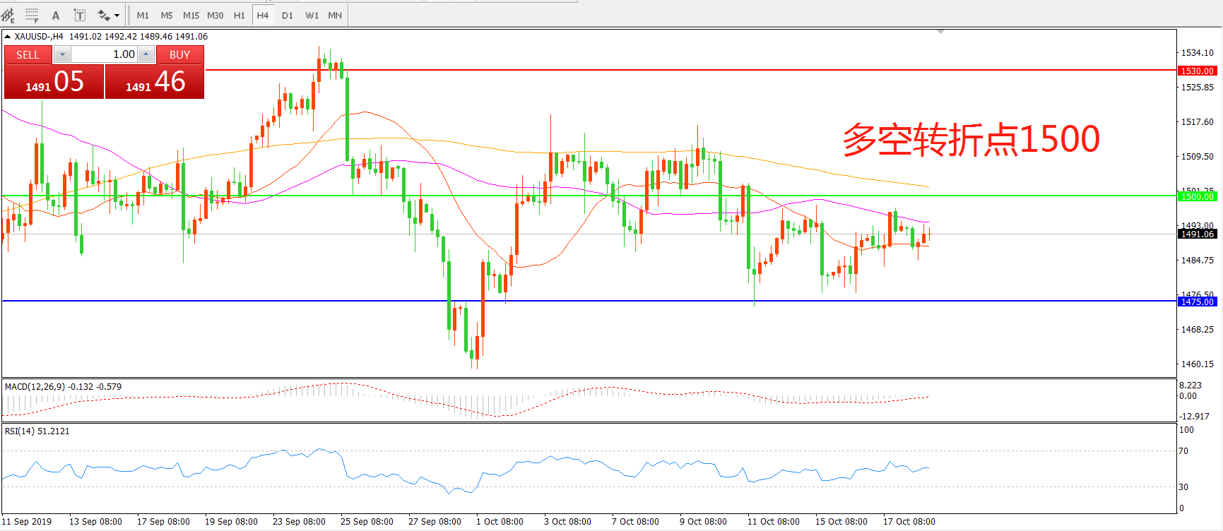 4小时图看,金价延续宽幅震荡走势且振幅逐渐收窄,1500关口成为多空争夺焦点,1475成为短期支撑,均线走平,MACD绿柱缩短,RSI指标走平,日内维持震荡依然是大概率事件。