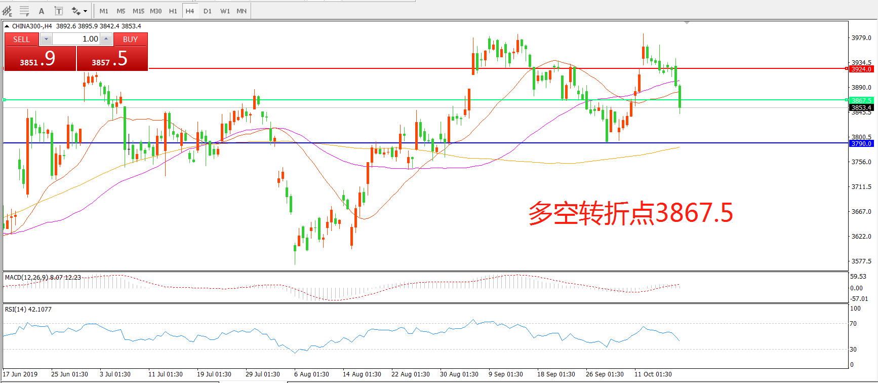 4小时图看,沪深300中阴连续下破,整体走势偏弱,3980、3924成为上方明显阻力,均线系统走平,MACD红柱缩短,RSI指标向下,日内延续下行概率较大。