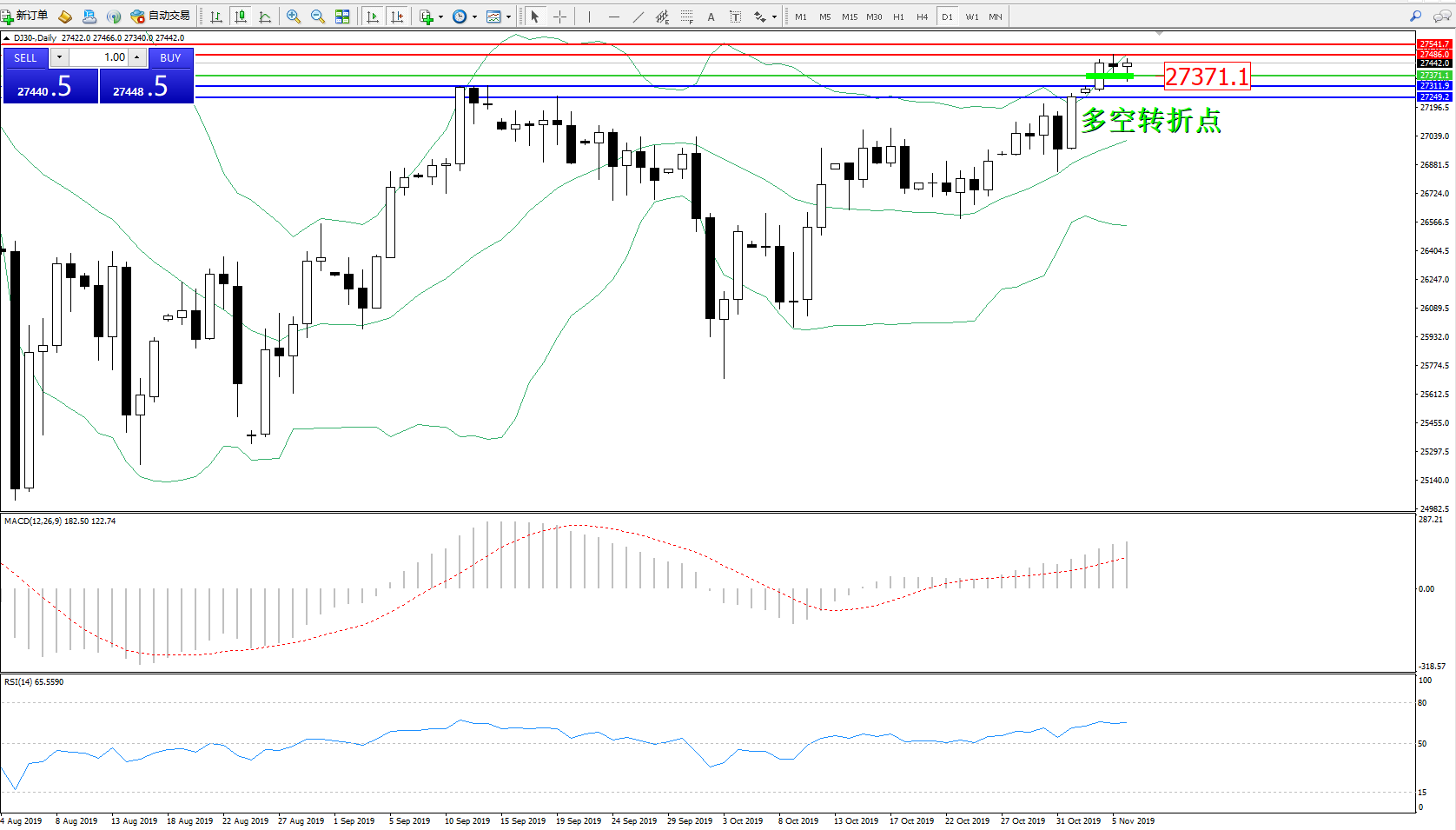 道琼斯指数11月6日(周三)收盘下跌0.10点,跌幅0.01%,报27492.56点。投资者继续关注国际贸易关系方面的不确定性因素、美企财报及并购消息等。贸易前景的不确定性驱使美债收益率走低,当前货币政策处于适度宽松状态,全球经济增速放缓和通胀压力受抑为采取取更多宽松政策提供了理由。在应对美国经济风险时,美联储三次降息是卓有成效的。美联储应以数据为依据,并先发制人。美联储由加息转变为降息是根据经济前景风险评估做出的选择。当经济下行时,我们倾向降息和购债。美国劳动力市场强劲,但低失业率并没有造成通货膨胀,价格压力受到合理抑制。