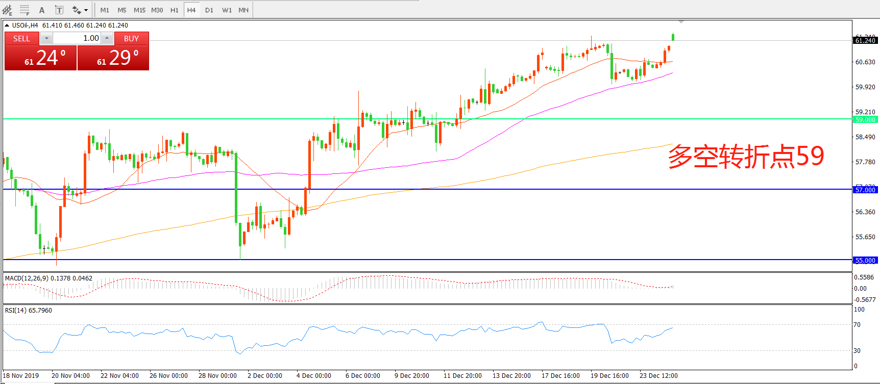 周二(12月25日)凌晨,美国石油协会(API)公布的数据显示,美国截至12月20日当周API原油库存减少790万桶,远远超过于市场预期,汽油精炼油同步减少,但由于圣诞假期原因,EIA原油库存数据将推迟至周六凌晨00:00公布,昨日美油休市一天,今日美油跳空高开,小幅回调,日内有望延续涨势。