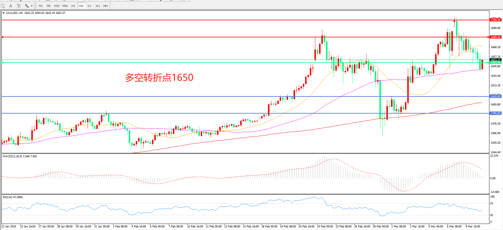 周二(3月10日),美国总统特朗普表示,他将采取“重大”措施,以保护经济免受疫情蔓延的影响,并提出0%的工资税率的想法。市场恐慌情绪有所缓解,现货黄金小幅回落,收报1652.81美元/盎司,但在新冠疫情持续蔓延,经济信心极度脆弱的当下,金价中期走势仍然看多。