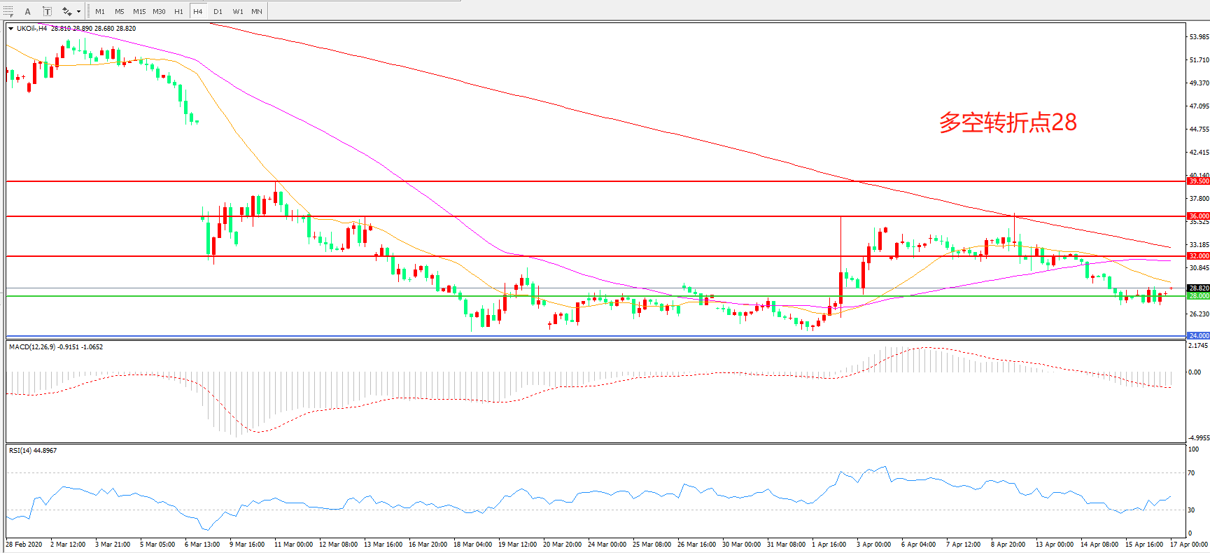 4小时图看,油价整体波幅依然较窄,低位震荡迹象较为明显,28美元成为短期支撑,32美元成为上方阻力, MACD绿柱缩短,RSI指标走平,日内延续震荡概率较大。