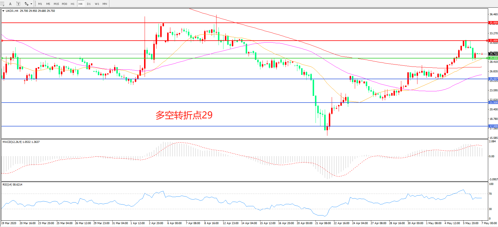 周三(5月6日),美国能源信息署公布的EIA原油数据显示,当周EIA原油库存增加460万桶,低于预期,但由于近期油价涨幅过高,多头获利回吐,布伦特原油小幅下跌,收报29.80美元/桶。