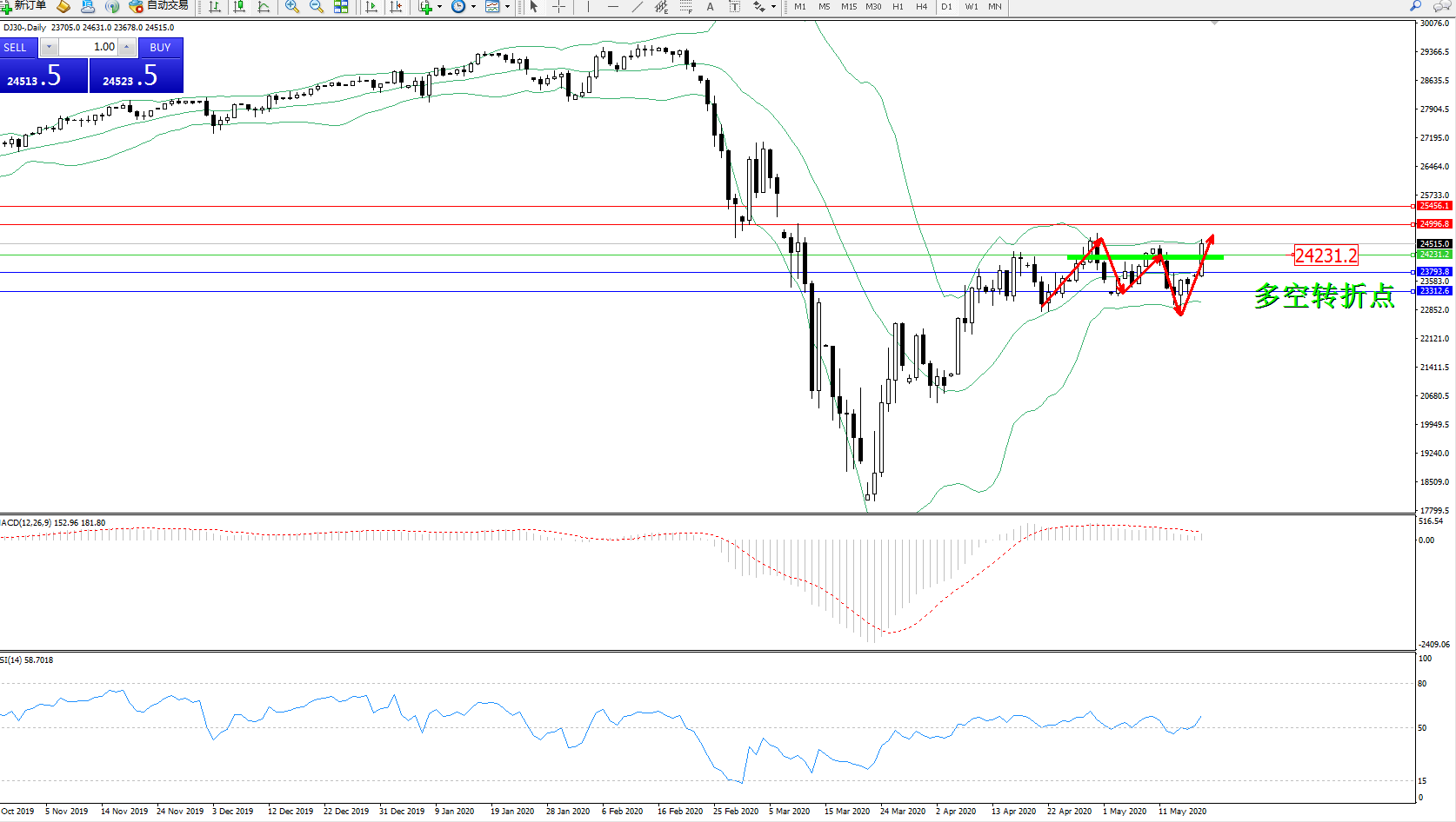道琼斯指数5月18日(周一)收盘上涨912.00点,涨幅3.85%,报24597.37点。受疫苗研发乐观前景的报道,市场风险偏好回暖,美国股市飙升至3月初以来的最高水平,验性新冠疫苗研究的初步结果显示良好前景,提振了经济有望加快重启步伐的预期。邮轮运营商、音乐会承办商和航空公司等得益于经济解封的股票大涨。虽然美联储主席鲍威尔称经济复苏之路可能拉长到2021年底,但强调央行有更多政策弹药,鲍威尔谈到美联储并未耗尽弹药,再加上积极的疫苗试验数据,助推股市上涨,这表明市场情绪变化如此之快。