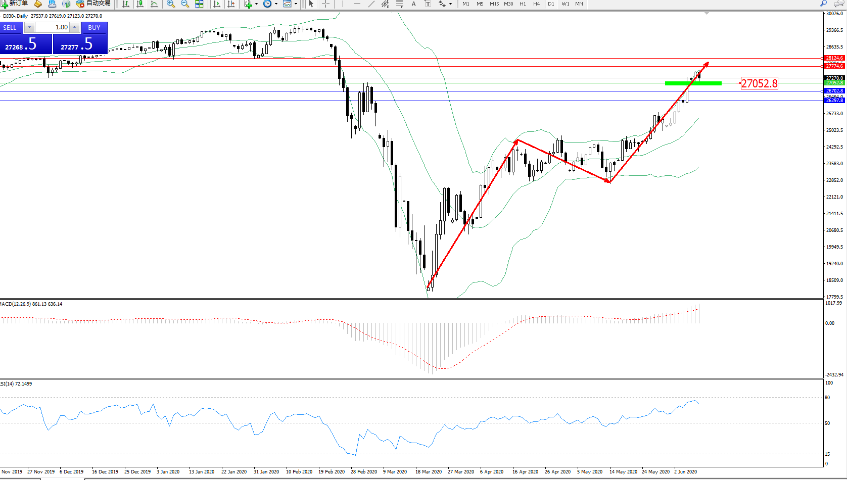 道琼斯指数6月9日(周二)收盘下跌300.10点,跌幅1.09%,报27272.30点。美股三大指数收盘涨跌不一,在能源和工业股的带领下,标普500指数停止了大幅上涨走势,投资者担忧近期风险资产的涨势可能过头;在6月份的6个交易日里上涨10%后,小型股周二跑输大盘;纳斯达克100指数一度突破10000点,苹果公司大涨。创纪录的反弹令全球股票市场市值增加了21万亿美元,技术指标显示反弹幅度可能已过头。美国股市人气在不到三个月的时间里从极度恐惧转向极度自信。市场风险偏好回落,世界银行预计今年全球经济前景不容乐观,谨慎的投资者等待美联储政策会议公布经济状况和进一步刺激措施。
