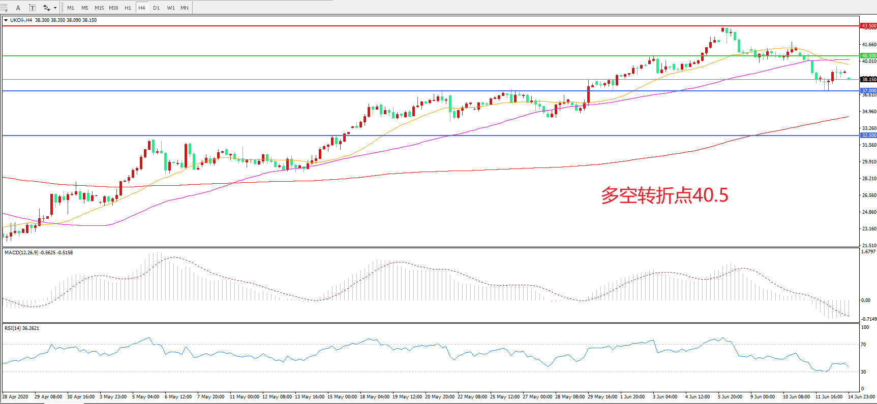 交易策略:  在40.50之下看跌,目标37.00      32.50