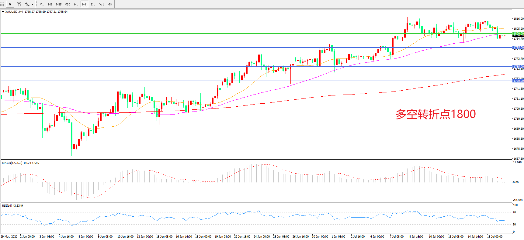 周四(7月16日),美国6月零售销售报告显示,6月零售销售环比增加7.5%,虽然不及前值,但均好于预期,美元指数趁机大幅回升令金价承压,现货黄金震荡下行,收报1798.44美元/盎司,获利了结情绪在市场上逐渐弥漫。