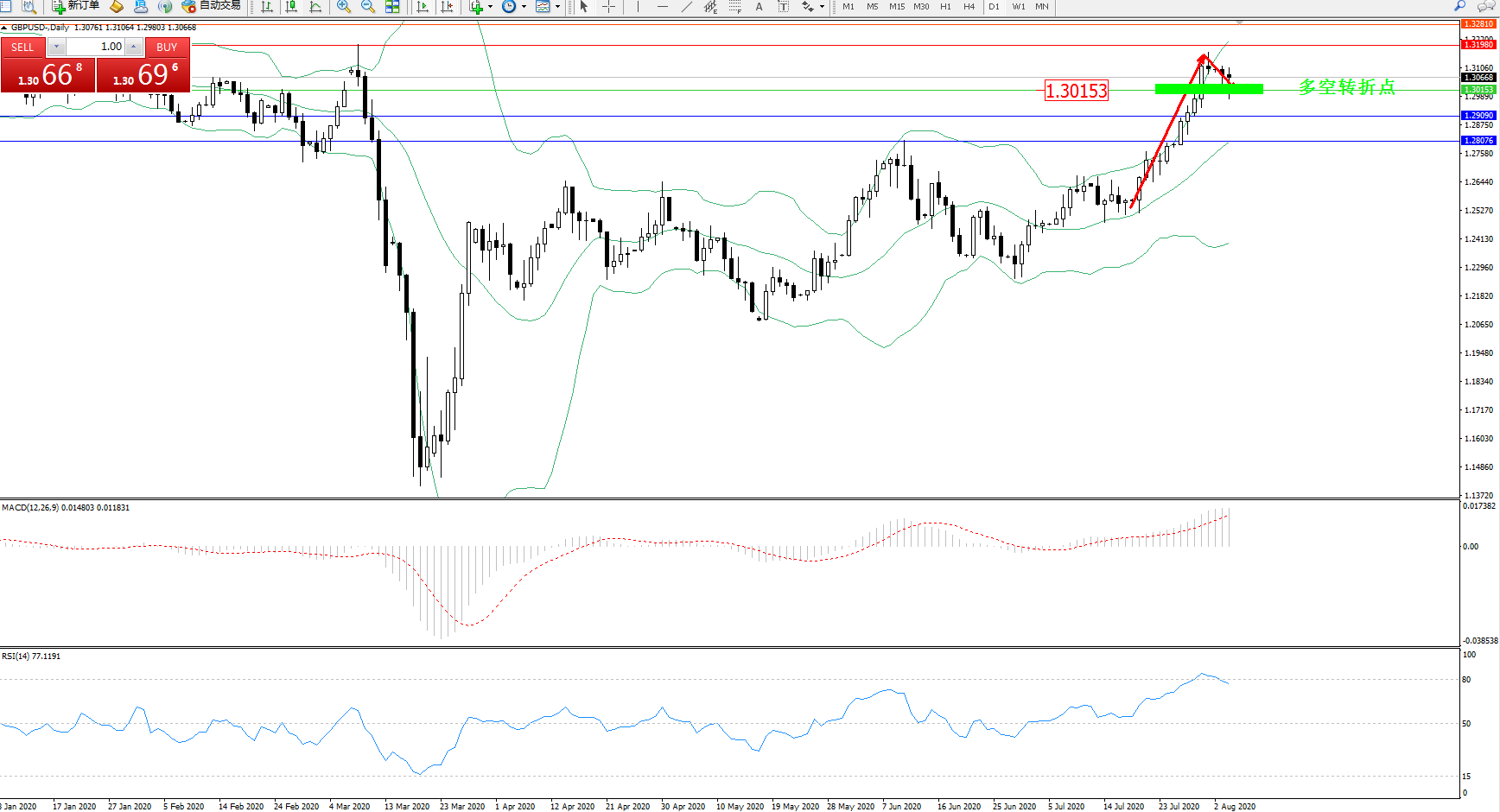 交易策略:1.30153上方看涨,目标1.31990、1.32810
