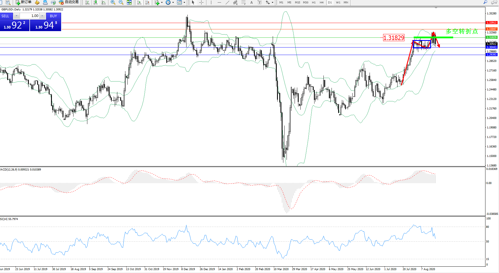 交易策略:1.31829下方看跌,目标1.30443、1.29393