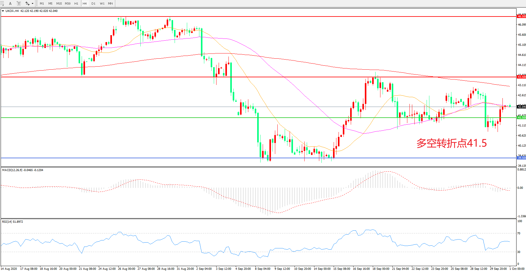 交易策略: 在41.50之上看涨,目标43.50 46.50