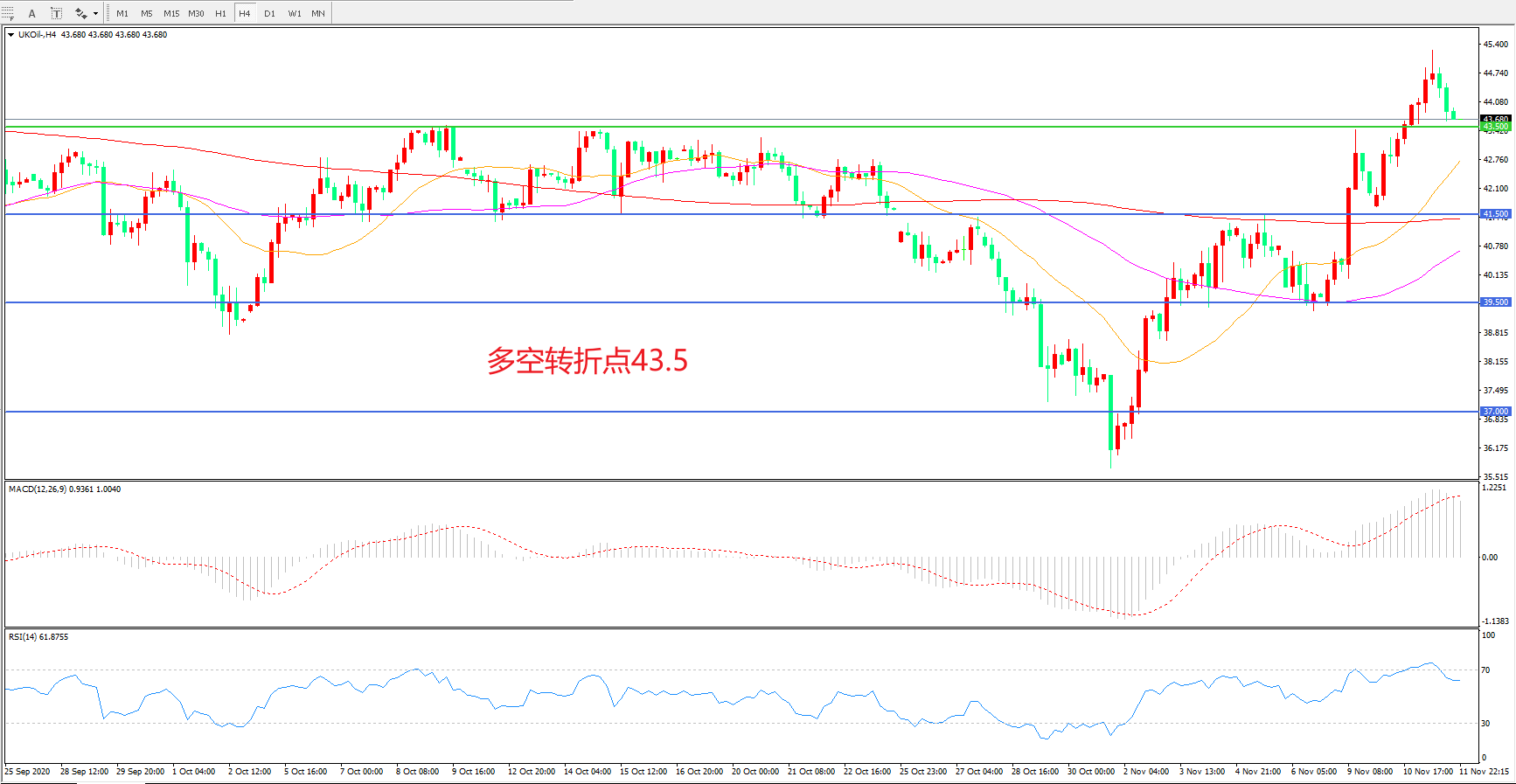 4小时图看,油价出现冲高回落,短期涨势暂缓,但依然处于上行趋势之中,43.5成为多空分水岭,短期均线拐头向上,MACD红柱减少,RSI指标走平,日内延续震荡概率较大。