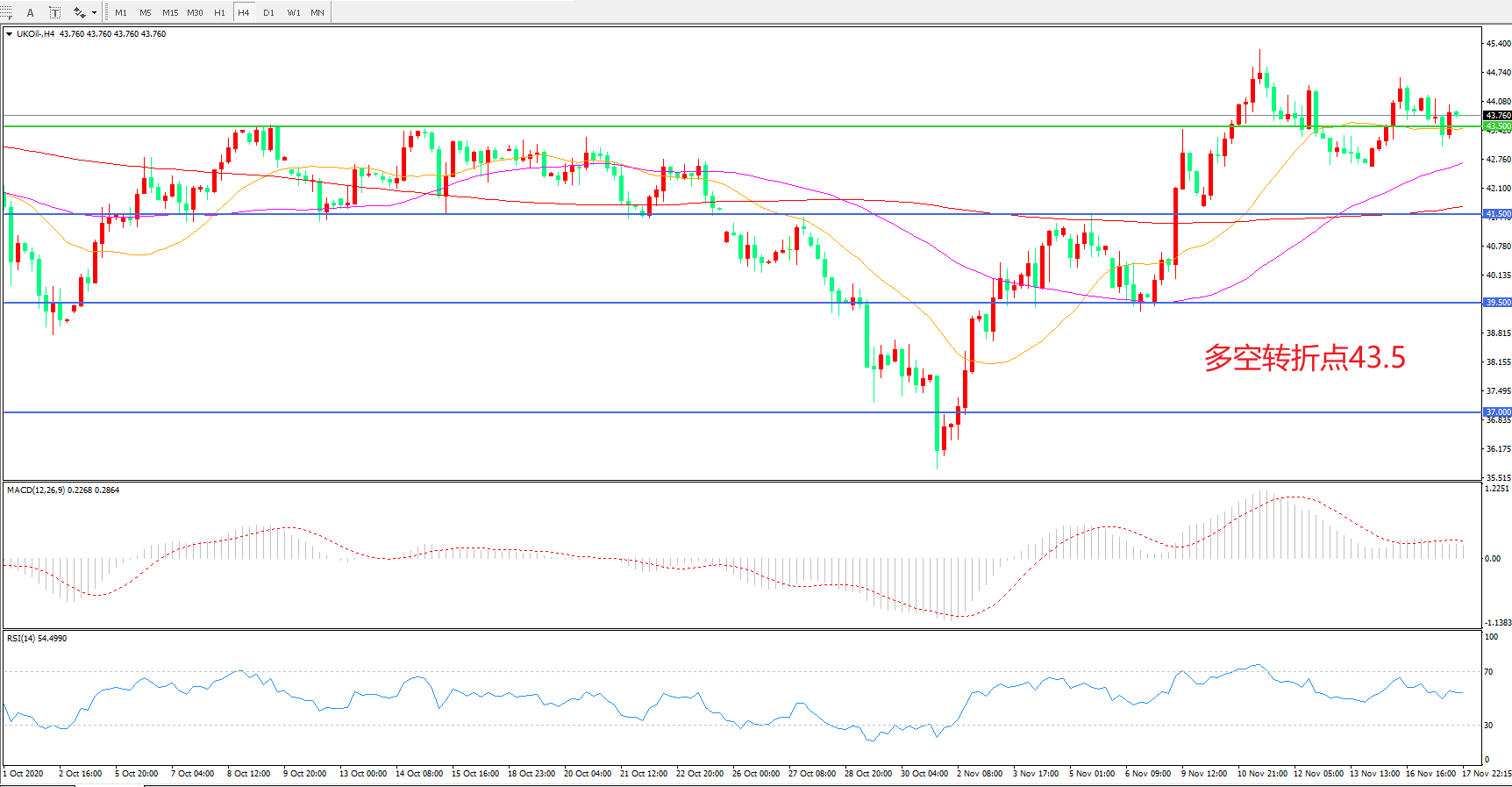 4小时图看,油价自低位连续拉升后,整体走势陷入震荡,43.5成为多空分水岭,21周期均线成为短期支撑,MACD红柱增加,RSI指标走平,日内震荡上行概率较大。