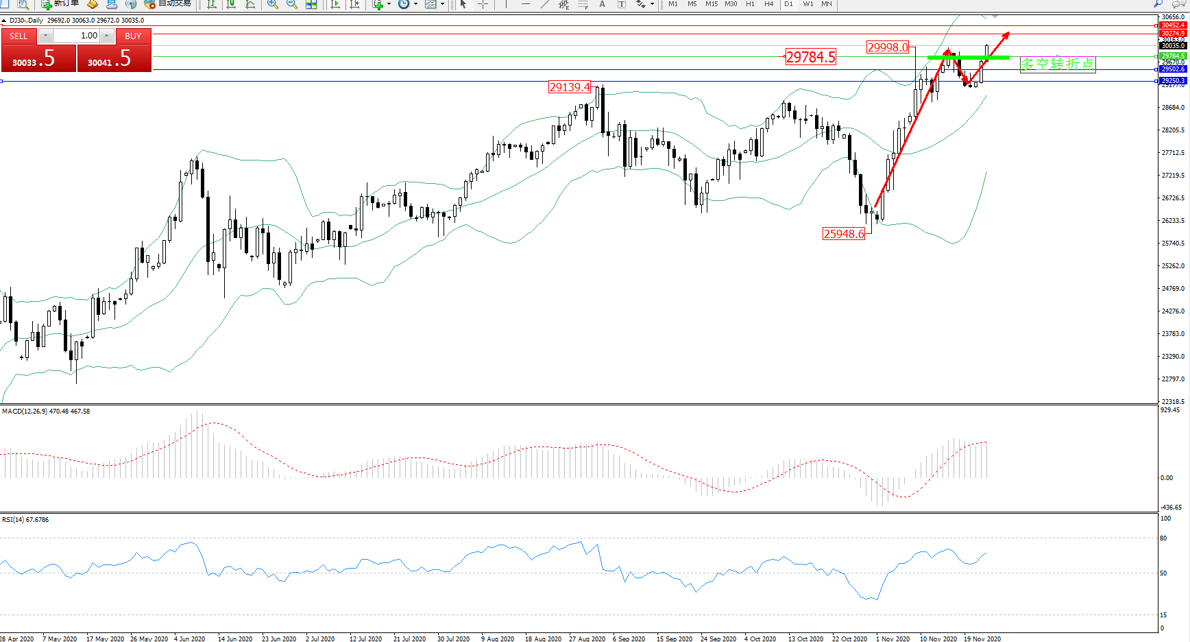 技术点评:多头动力低位强势拉升至布林带指标上轨附近节点后维持宽幅整理走势,持续窄幅震荡突破前期高位29998位置后有继续上扬态势,布林带指标呈收口走势中,多头动力持续向上移动,MACD指标处于多头区域维持整理平移中,RSI指标处于多头动力短暂回撤后出现持续拉升中;