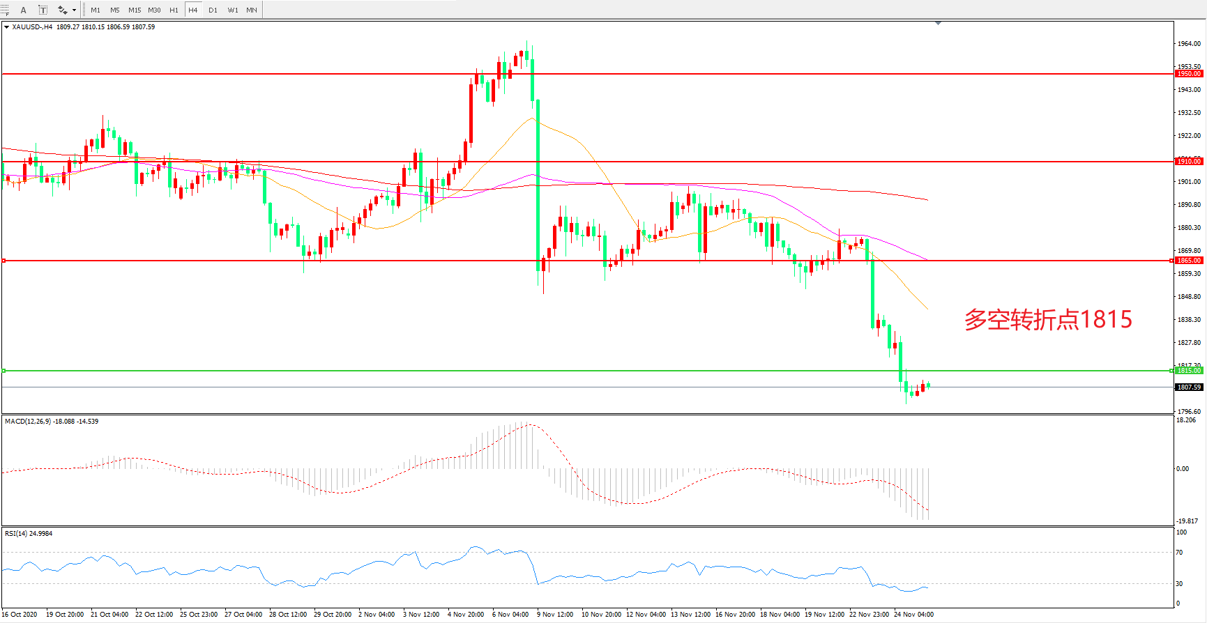 周二(11月24日),特朗普政府将开始启动过渡程序,宏观不确定性风险进一步降低,市场避险情绪减弱,黄金抛售加剧,现货黄金大幅下挫,收报1809.28美元/盎司。当前市场依然处于对欧美经济复苏以及新冠疫苗会尽快推出的乐观预期中,由此产生的逻辑是货币政策收紧以及名义利率抬升预期,自然对黄金走势颇为不利。