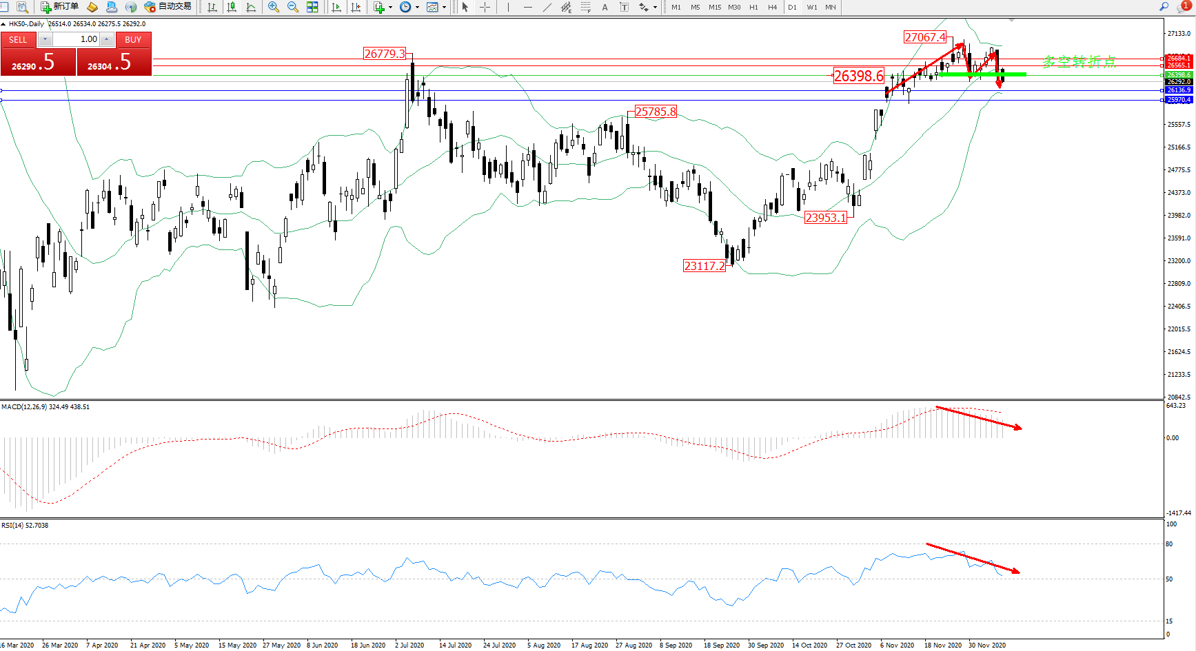 香港恒生指数12月8日(周二)收盘下跌202.29点,跌幅0.76%,报26304.56点;港股指数分化严重,恒指全天弱势,科技股强势,致恒生科技指数涨1.77%。中石化、汇丰控股、中国平安皆跌超3%,拖累大市下跌;电池股、汽车股、手游股相对活跃,药品股与军工股跌幅靠前。京东健康首日上市大幅收涨55.85%,市值超3400亿港元。今日南下资金净流入39.75亿港元,大市成交额为1354.18亿港元。据香港电台,香港特区政府卫生署卫生防护中心今日下午介绍,香港新增100例新冠肺炎确诊病例,包括27例源头不明个案。沪港AH溢价指数为过去10年较高水平。随着四季度以来成长股出现高位回落、风格有向价值股切换的迹象,股息率又较其他市场主要指数相对更高的港股,有望跟随经济复苏的脚步,越来越受到全球资金的青睐。
