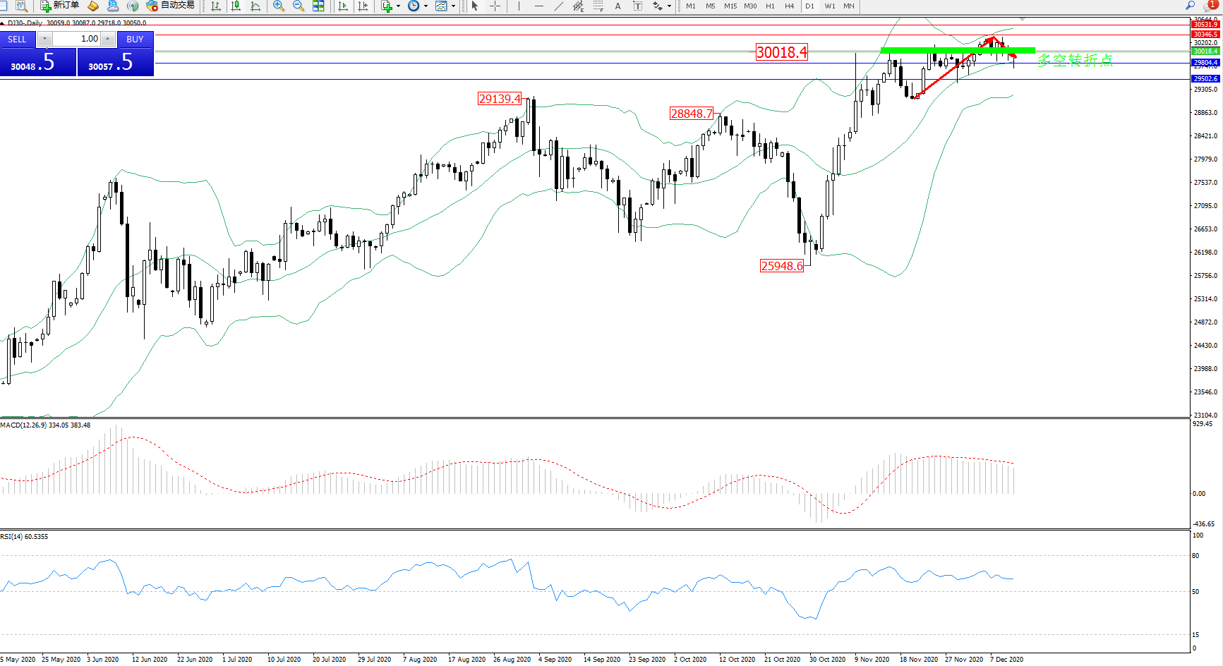 道琼斯指数12月11日(周五)收盘上涨47.10点,涨幅0.16%,报30046.37点。美股三大指数收盘涨跌不一,股市盘中波动剧烈,因美国国会议员通过了可令联邦政府避免关停的权宜支出法案,但国会没有给出关于抗疫刺激方案推出在即的信号。由于刺激方案谈判陷入僵局,加之疫情肆虐下投资者担忧会推出更严格防疫措施,美联储发布了将于本周随同季度经济预测摘要公布的新图表示例。新图表将显示“FOMC成员做出实际国内生产总值、失业率、个人消费支出(PCE)通胀率和核心PCE通胀率预测后,对跟这些预测相关的不确定性和风险的判断”。根据11月FOMC会议纪要,新图表将在12月15-16日FOMC会议结束发布的季度经济预测摘要中公布。